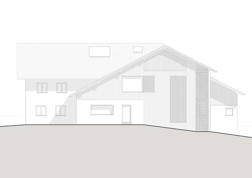Der ehemalige Wirtschaftsteil wurde zu einem großzügigen Wohnraum gestaltet. Zentral ist hierbei der Erschließungskern, welcher durch versteckte Türen kurze Wege schafft und den großen Luftraum unterteilt und maximale Aufenthaltsqualität der jeweiligen Nutzungszonen generiert.